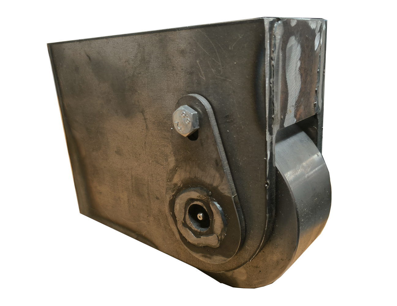 Rulla D100. Akseli D40. Hitsataan lavan takapalkin alapintaan, lisää tarvittaessa väliin levyä niin että rulla on noin 10mm kiskon alapuolella.